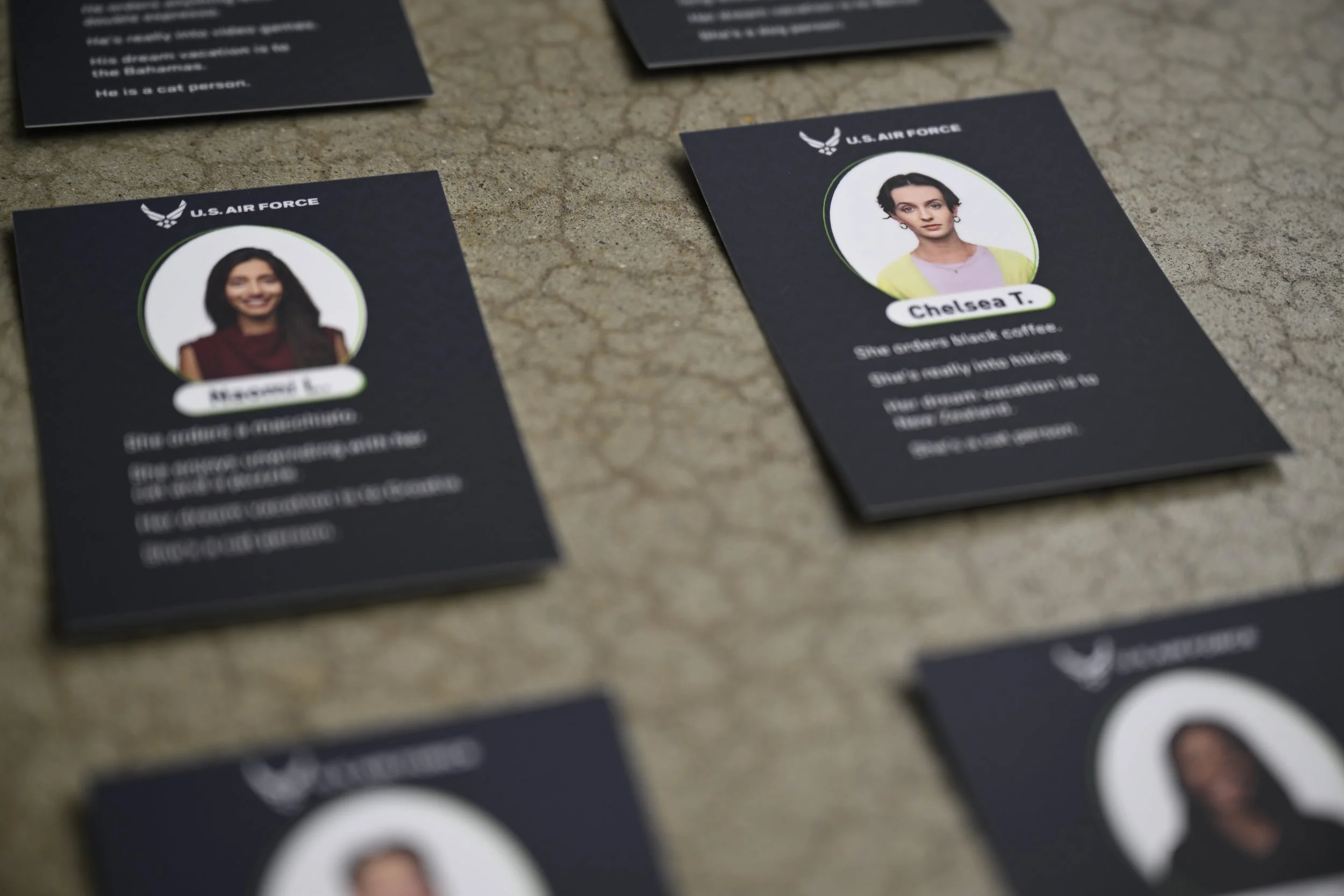 Guess the Airman is a game where Airmen attempt to pick out fellow Airmen out of a crowd of seemingly ‘normal’ people. We highlighted Airmen in a way that humanizes service members. Serving our country doesn’t mean you only order black coffee and work out as a hobby. It means your education is paid for, you get top-of-the-line insurance, paid time off, and travel perks all while serving our country. We took this concept to Randolph Air Force Base and hosted a game show with Airmen. I designed print assets, including the gameplay cards, edited all of the “Airman Reveal Interviews” posted after gameplay episodes, and animated the logo I created for use in “Secondary Content,” posted in between episodes. Round 1: The player eliminates eight character cards based on appearance alone. Airmen used “regs” knowledge to check if their hair, piercings and tattoos were in regulation for the Air Force, some based the decisions on age, and some even guessed careers based on looks! Round 2: The host read off a quick list of lifestyle facts about each character left in the game: Their coffee order, hobbies, dream vacation destination, and whether they are a cat, dog or plant person. The player then eliminated six more character cards. Round 3: The contestant chooses 2 deeper questions about each character to get answered before making their final guess: What do you do for work?What is your favorite part of your job?What gives your life meaning?What advice would you give the younger version of yourself?What’s something you’ve learned about yourself recently?